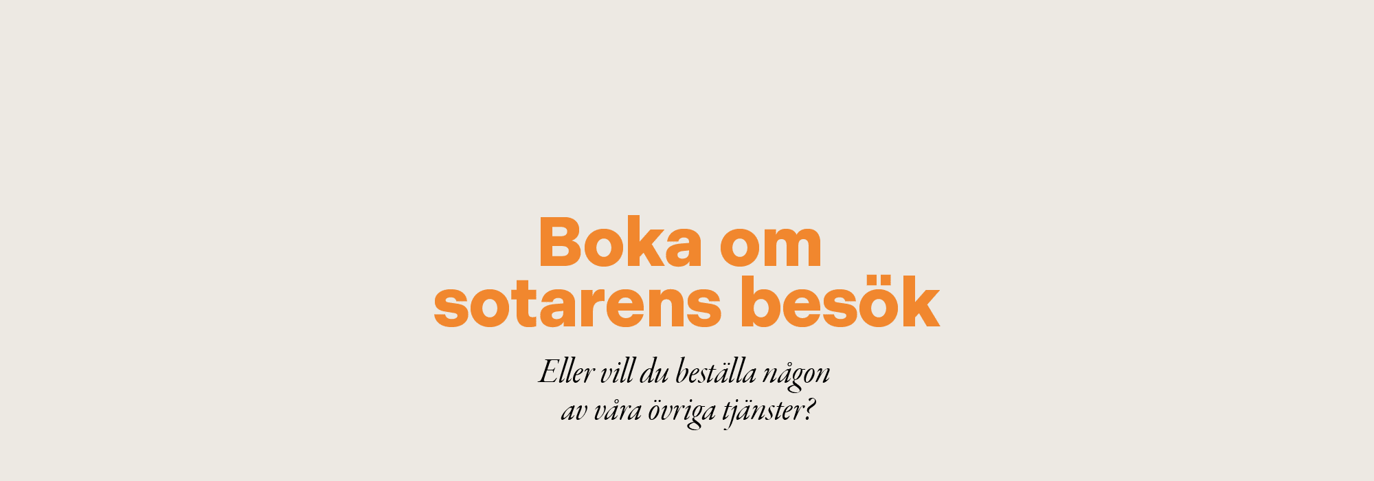 Logga in i bokningsportalen och välj ditt sotningsdistrikt, så kan du själv boka vissa tjänster. Alla tjänster är inte bokningsbara online ännu. Läs mer om: